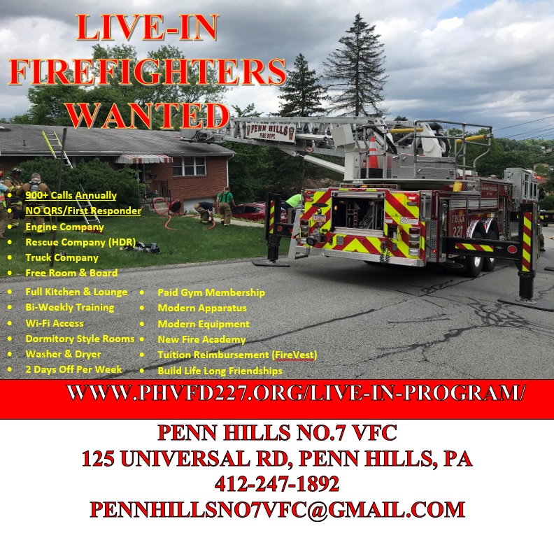 There are two goals of the Penn Hills No.7 Live-In program. First is to provide a fully staffed 100 % volunteer fire station for quick response for service 24 Hours a day, 7 days a week. The second is to give you the firefighter the necessary education needed to procure employment within a career department. Living at the fire department is a unique experience that can be as rewarding and educational as you choose to make it. The program is both demanding and time consuming, but it is our hope that it creates the discipline and respect that is expected in a career fire department. Motivation, dedication and professionalism are qualities that successful Live-In’s must possess. Primarily, our focus is to recruit personnel with previous Fire and Rescue experience, although none is required to file an application. Prospective men and women can come from all areas of the United States and abroad.
