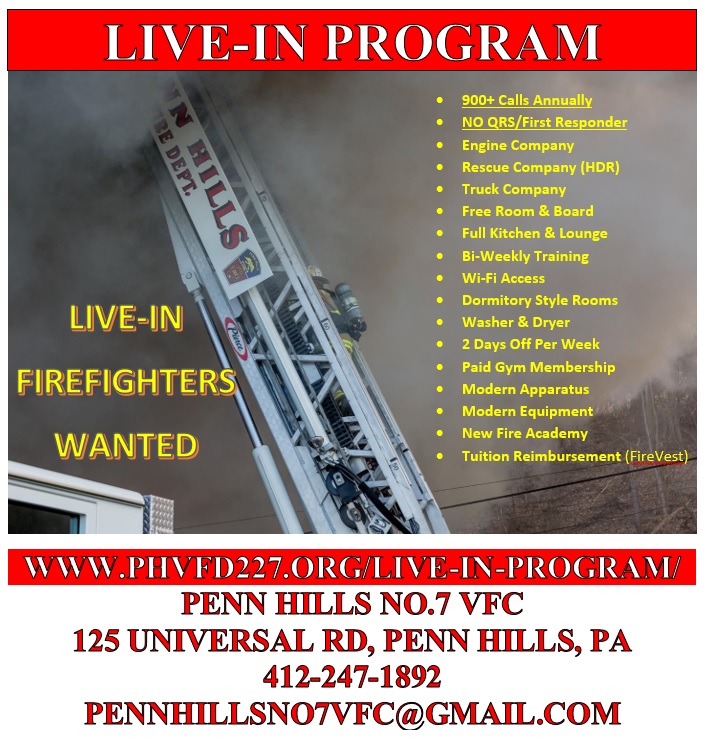 If you are interested in joining our exciting new Live-In Program, Please contact the Fire Chief by e-mail at [email protected] or call us at (412)-247-1892 or stop past the station.